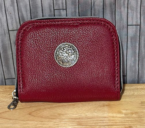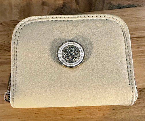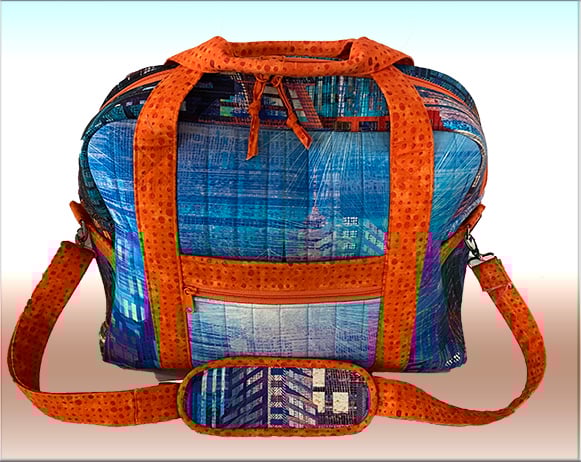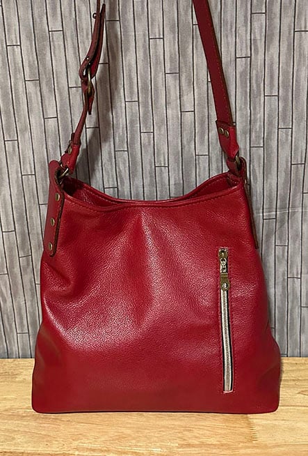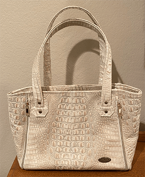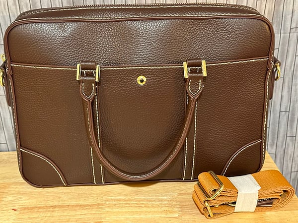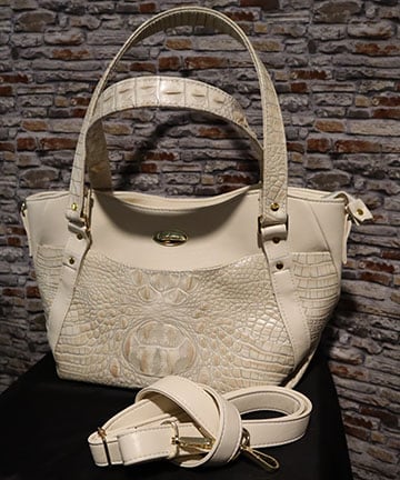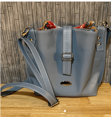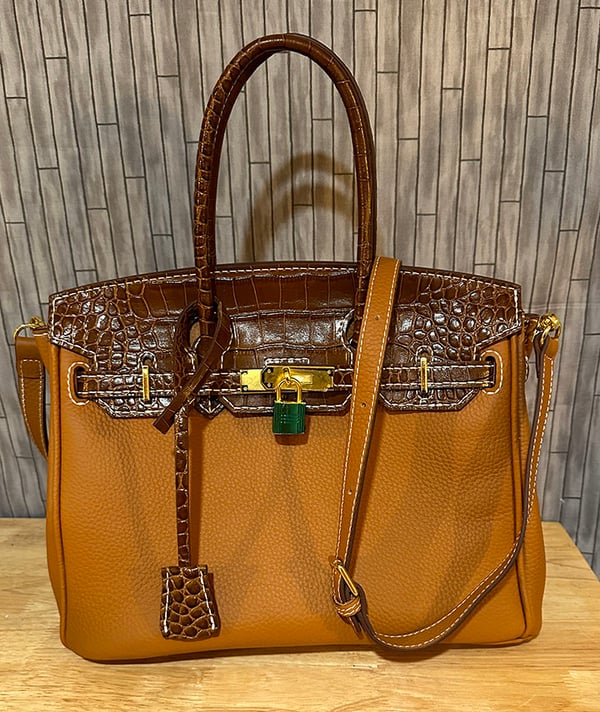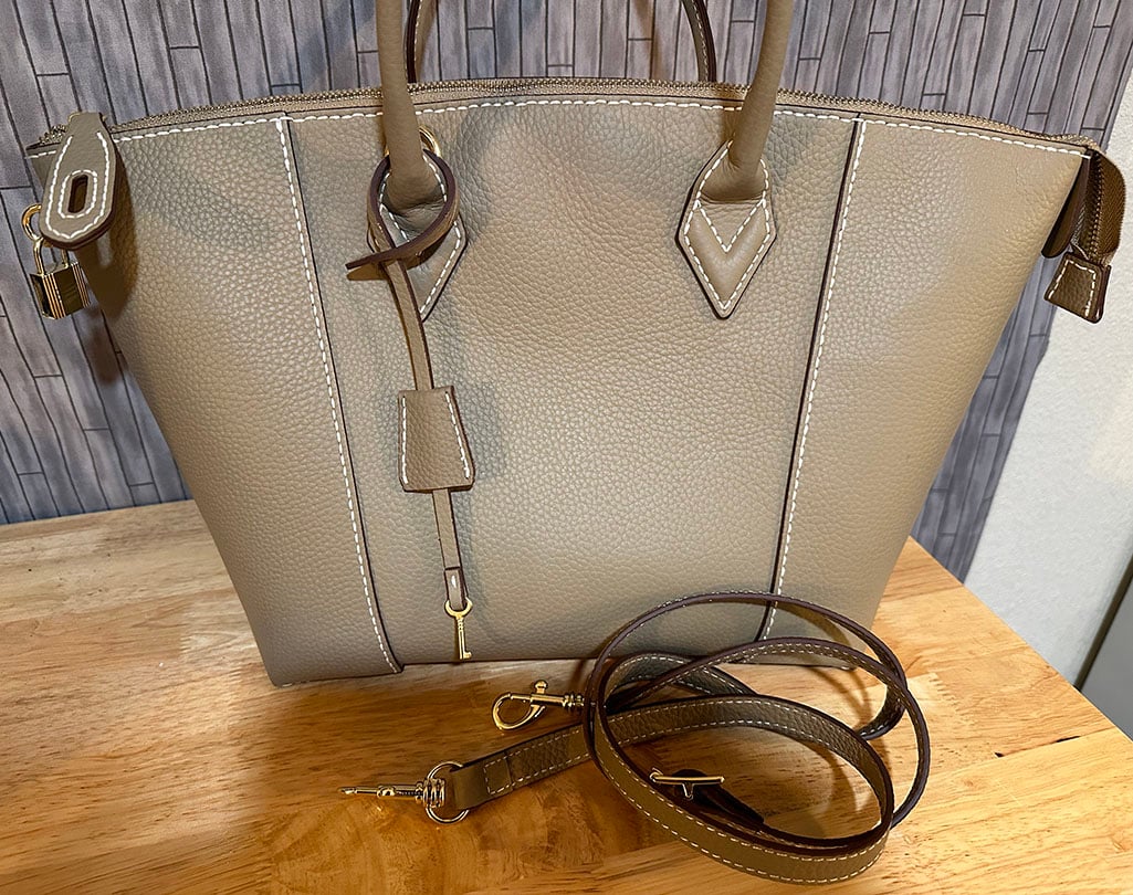 Large hand-stitched tote bag with lining and pockets (one zippered and three slip pockets). It has a lock with a hidden key. The adjustable strap is 43" .